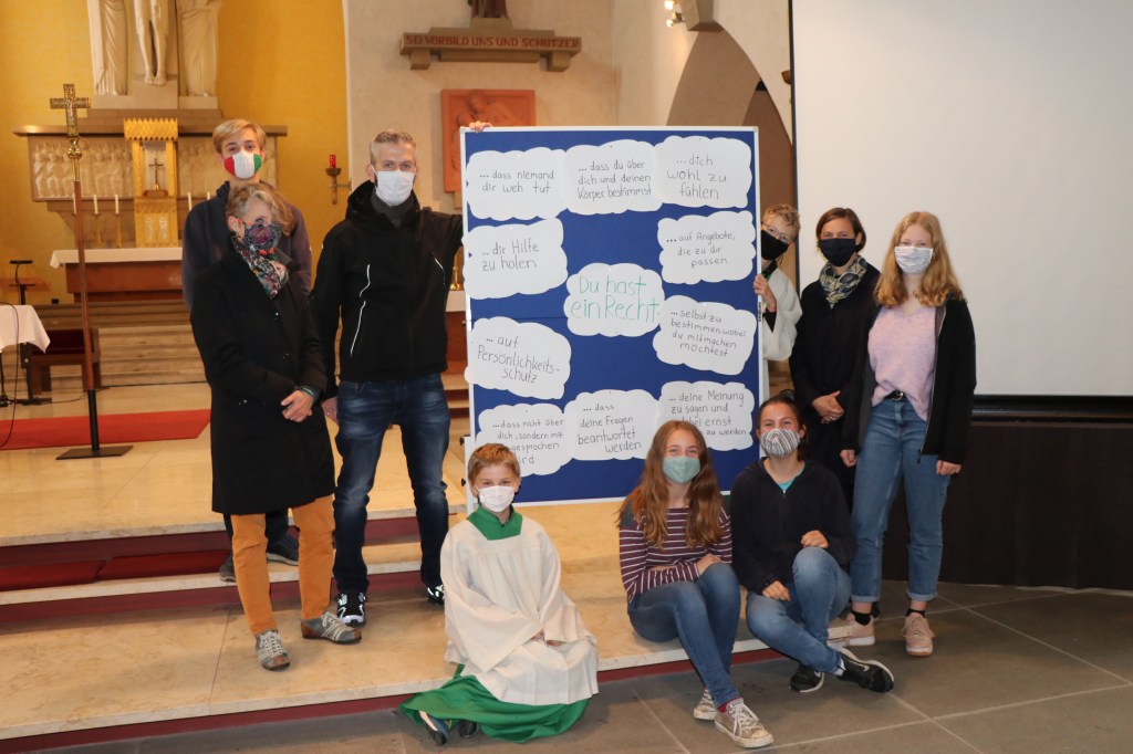 Das fertige „institutionelle Schutzkonzept“ wurde in der Familienmesse am 11. Oktober um 11:00 Uhr vorgestellt. Die Ministranten stellten in kurzen Sprechszenen und auf Bildern, die von Theresa Detterbeck gemalt wurden die Kinderrechte vor, die Grundlage für den Verhaltenskodex in unserem Schutzkonzept sind.